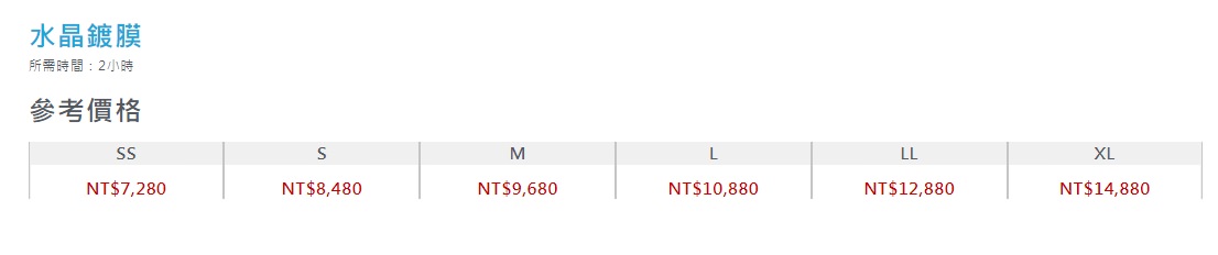 ▼汽車鍍膜價格與相車款對應的尺寸表,在KeePer PRO SHOP官方網站上皆可查詢到。