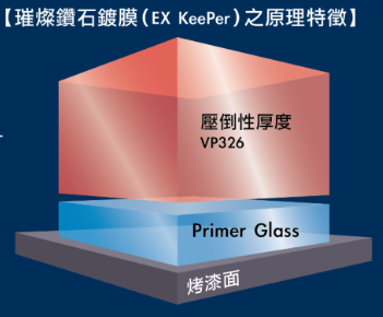 最後一項重量級的產品,就是「EX璀璨鑽石鍍膜」,雖然官網寫著「新車專用」,但舊車只要進行拋光工程,也是可以「享用」這項服務。這個Keeper鍍膜跟前面幾個鍍膜相比,大概就是商務艙與頭等艙的區別,「EX璀璨鑽石鍍膜」從基底的玻璃層就使用更高級的「Primer Glass」,上面的保護層則是採用有「有機物質」的VP326,VP326的特性可以讓水垢不容易附著在車子烤漆上,這跟市面上大部分使用「無機物質」的鍍膜材質有著本質上巨大差異。