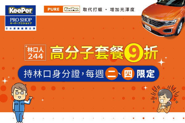 「林口人專屬」優惠。只要您的身分證住址位於 林口區,在4/1起每個週二與週四,預約施作高分子增豔膜系列套餐,即享 9 折專屬折扣。讓您的愛車在多雨的林口,跟髒汙水痕說掰掰!