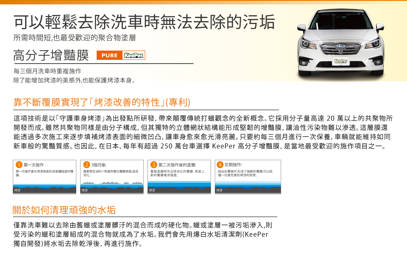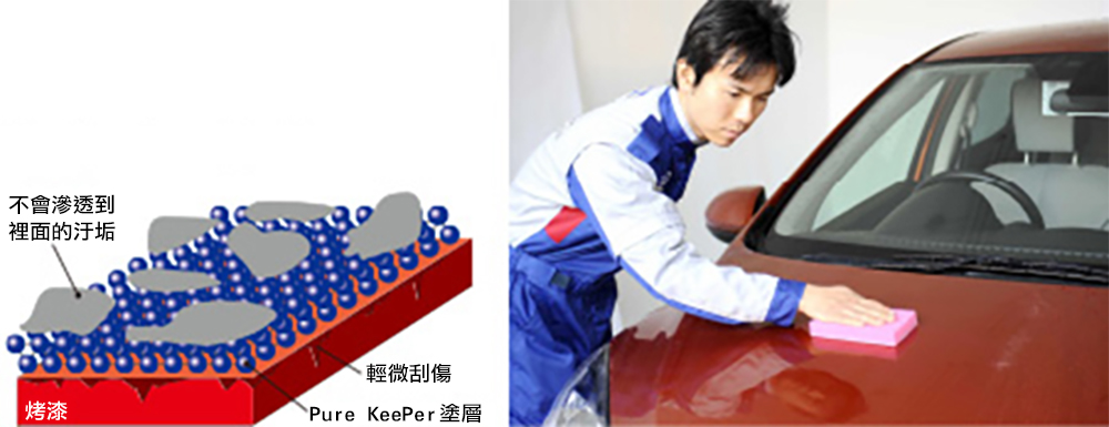 高分子增艷膜(Pure KeePer)並不是使愛車絕對不會髒汙的「魔法屏障」。然而它卻具有即使愛車髒掉了也不會使污垢浸透到塗層內部,很容易去除污垢的特性。 因此,在重複施工的過程中不但不會直接與烤漆摩擦,並具有逐漸強化塗層(填補傷痕),使烤漆越來越好「改善烤漆面的方向性(已取得專利)」的特性。這是真正打破傳統思維的全新汽車護漆概念。